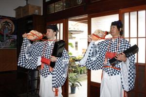 当館にも位上・先途の両松聖の命を受けた二人の山伏が訪れ、景気よく法螺を鳴らしてくださいました。